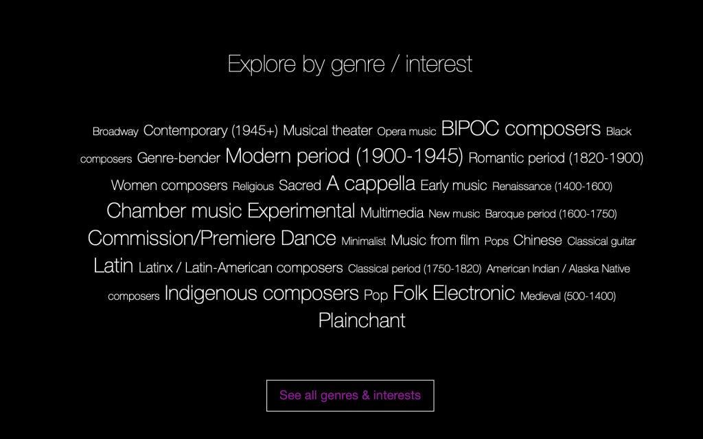 • A searchable interface that allows musical discovery by composer, instrumentation, accessibility, family-friendliness, and more—not just an artist’s name or popularity.